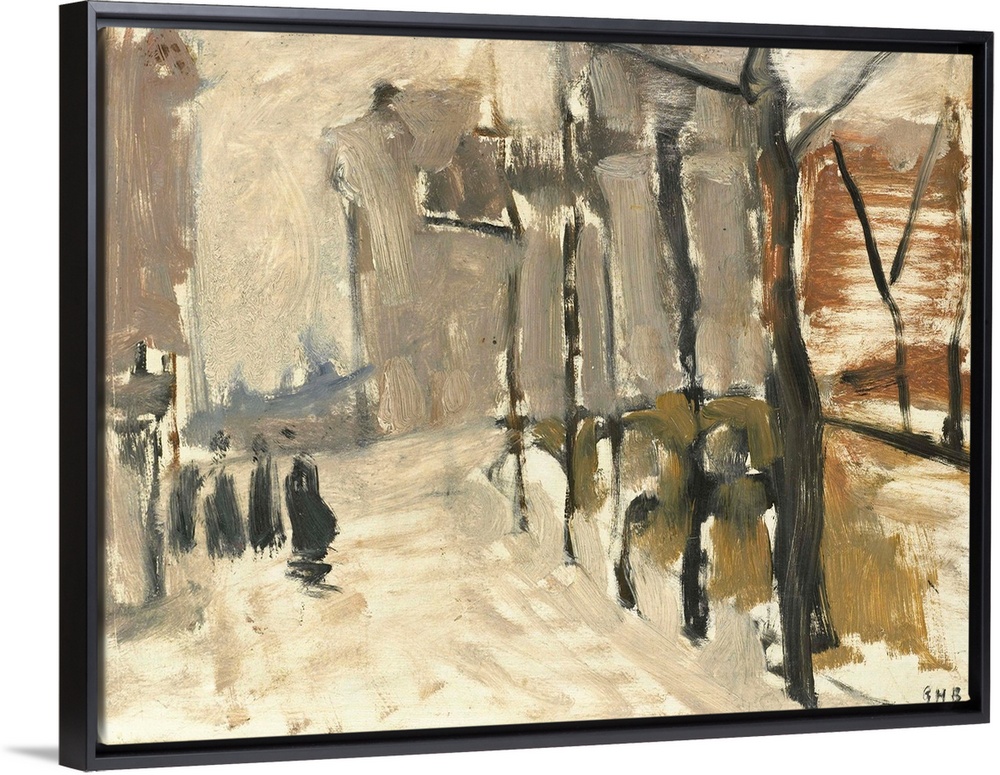 <p>View in the Hague, George Hendrik Breitner, by George Hendrik Breitner, c. 1880-1923, Dutch painting, oil on panel. Abstract study in fog or snow with a bridge and a line of trees and the suggestion of a few figures.</p>