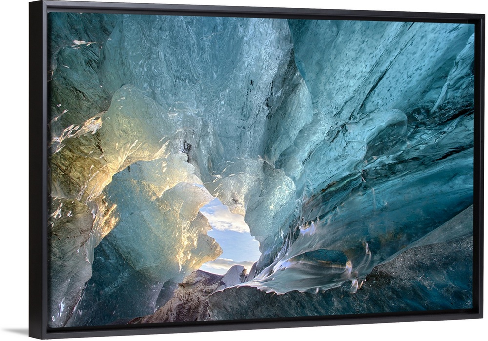 <p>View inside an ice cave under the south Vatnajokull Glacier, captured at sunrise during winter when the ice caves are accessible, near Jokulsarlon, Southern Iceland, Iceland, Polar Regions</p>