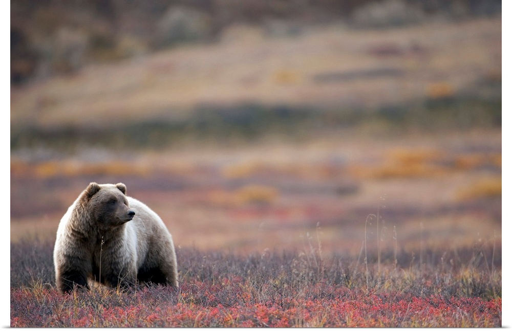 <p>View of a Grizzly Bear standing in the fall tundra, Denali National Park, Interior Alaska</p>