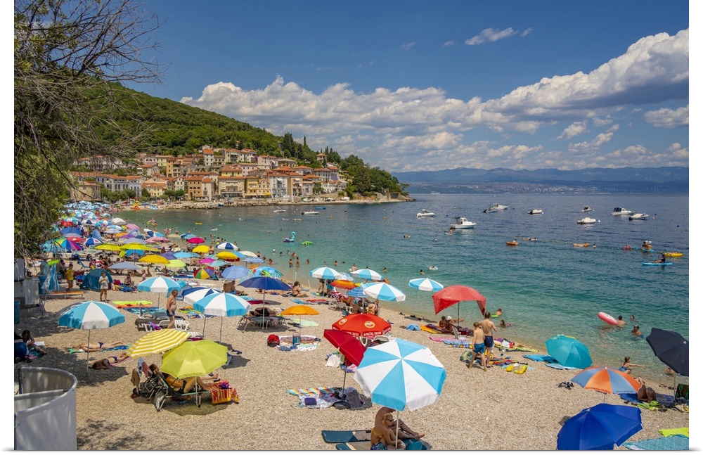 <p>View of beach and the town in the background in Moscenicka Draga, Kvarner Bay, Eastern Istria, Croatia, Europe</p>