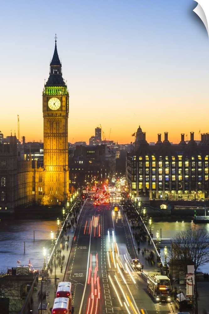 <p>High angle view of Big Ben, the Palace of Westminster and Westminster Bridge at dusk, London, England</p>