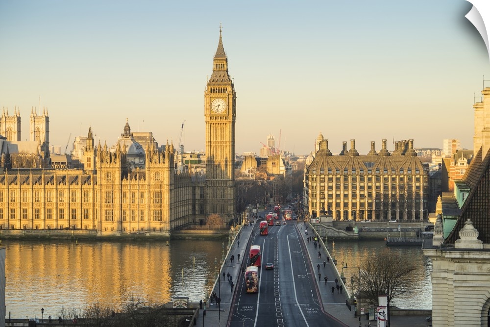 <p>High angle view of Big Ben, the Palace of Westminster, and Westminster Bridge, London, England</p>