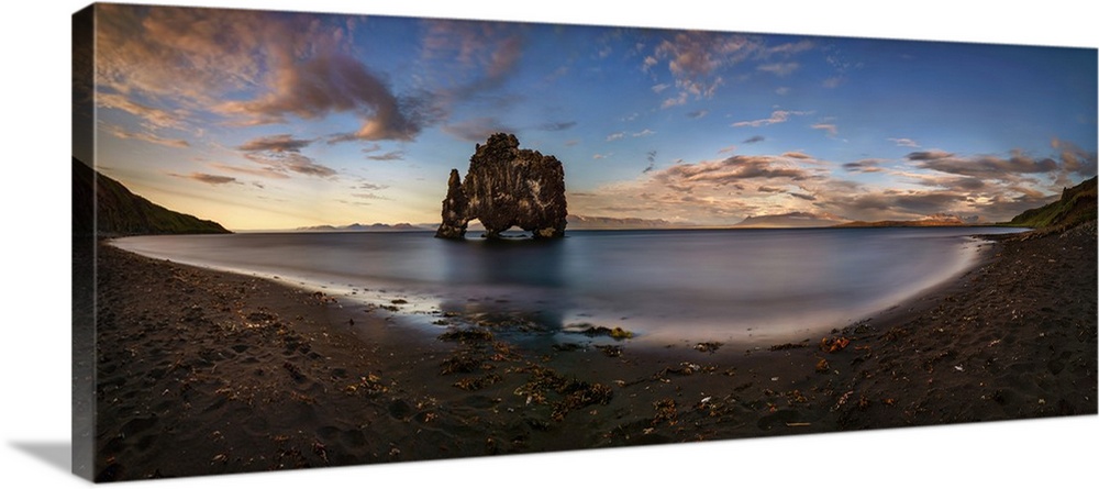 <p>View of black sand beach at sunset, Hvitserkur, Iceland.</p>