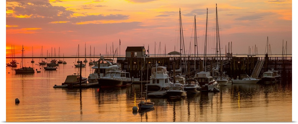 <p>View of boats at a harbor during sunset, Rockland Harbor, Rockland, Knox County, Maine, USA</p>