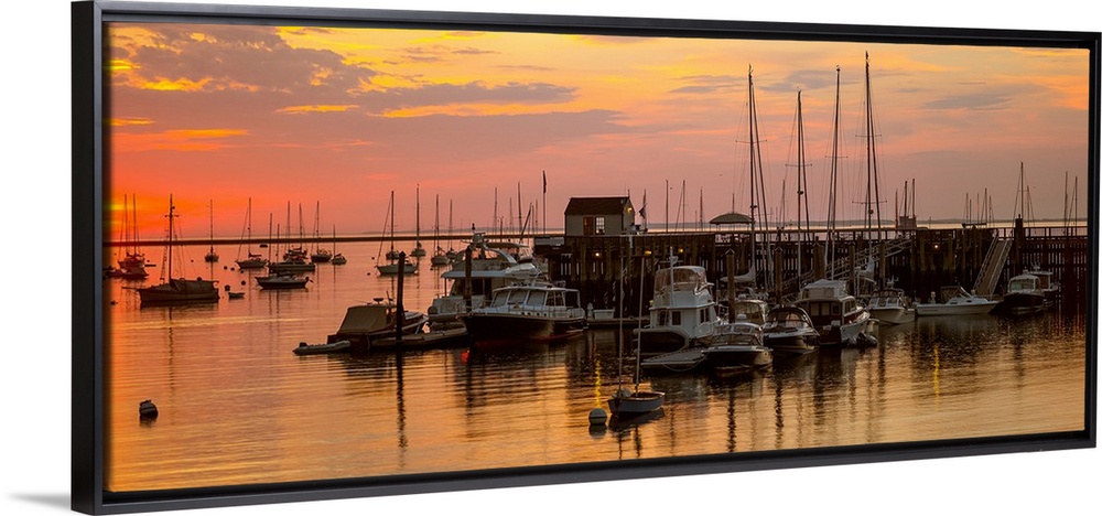 <p>View of boats at a harbor during sunset, Rockland Harbor, Rockland, Knox County, Maine, USA</p>