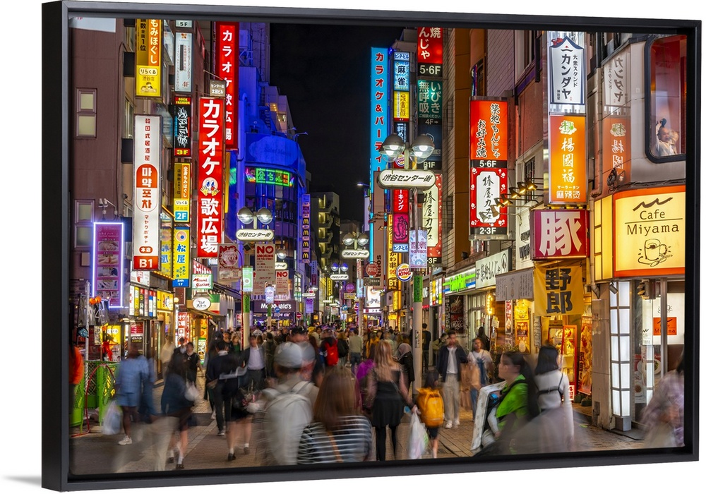 <p>View of busy street and neon lights at night in Shibuya District, Kamiyamacho, Shibuya City, Tokyo, Honshu, Japan</p>