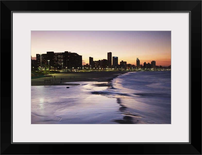 <p>View of city skyline and beachfront at sunset, Durban, KwaZulu-Natal, South Africa</p>
