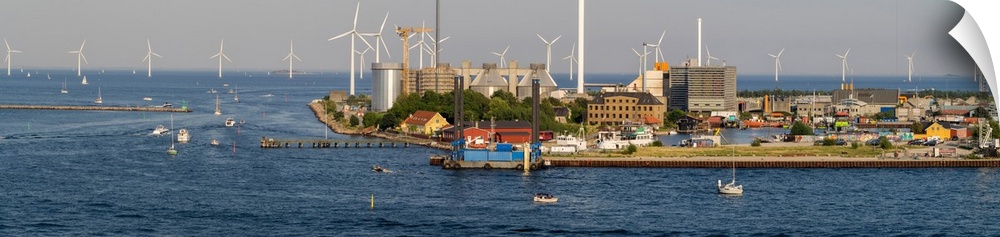 <p>View of city with wind turbines in the sea, Copenhagen, Denmark</p>