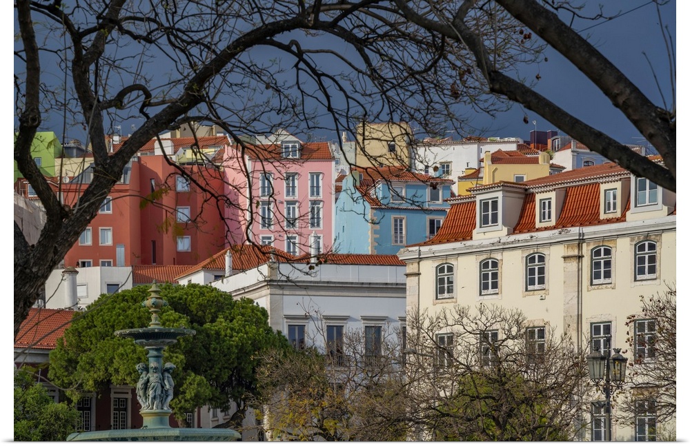 <p>View of colourful houses from Praca do Rossio and Carmo Archaeological Museum, Lisbon, Portugal, Europe</p>