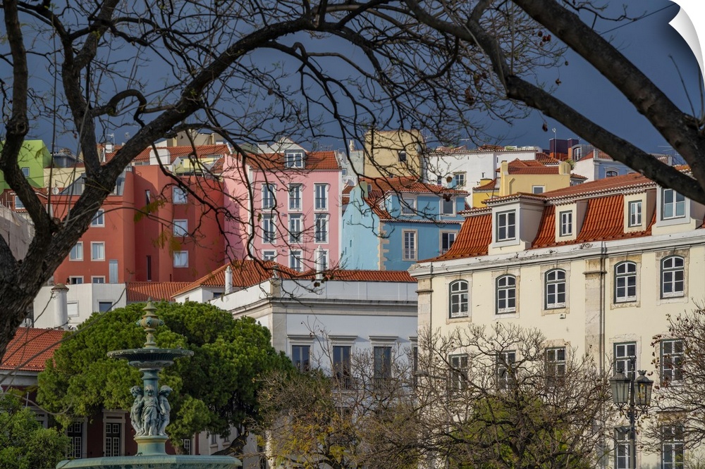 <p>View of colourful houses from Praca do Rossio and Carmo Archaeological Museum, Lisbon, Portugal, Europe</p>