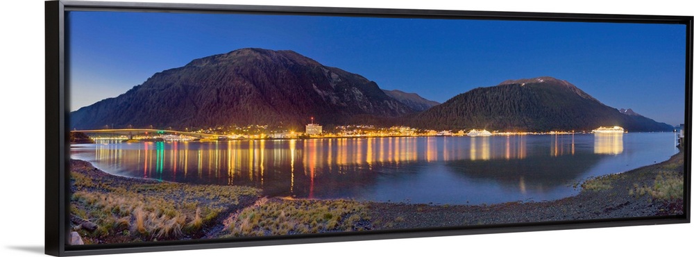 <p>Downtown Juneau photographed across the water from Douglas Island, city lights reflected in the water, twilight, summer, Juneau, Southcentral Alaska, USA.</p>