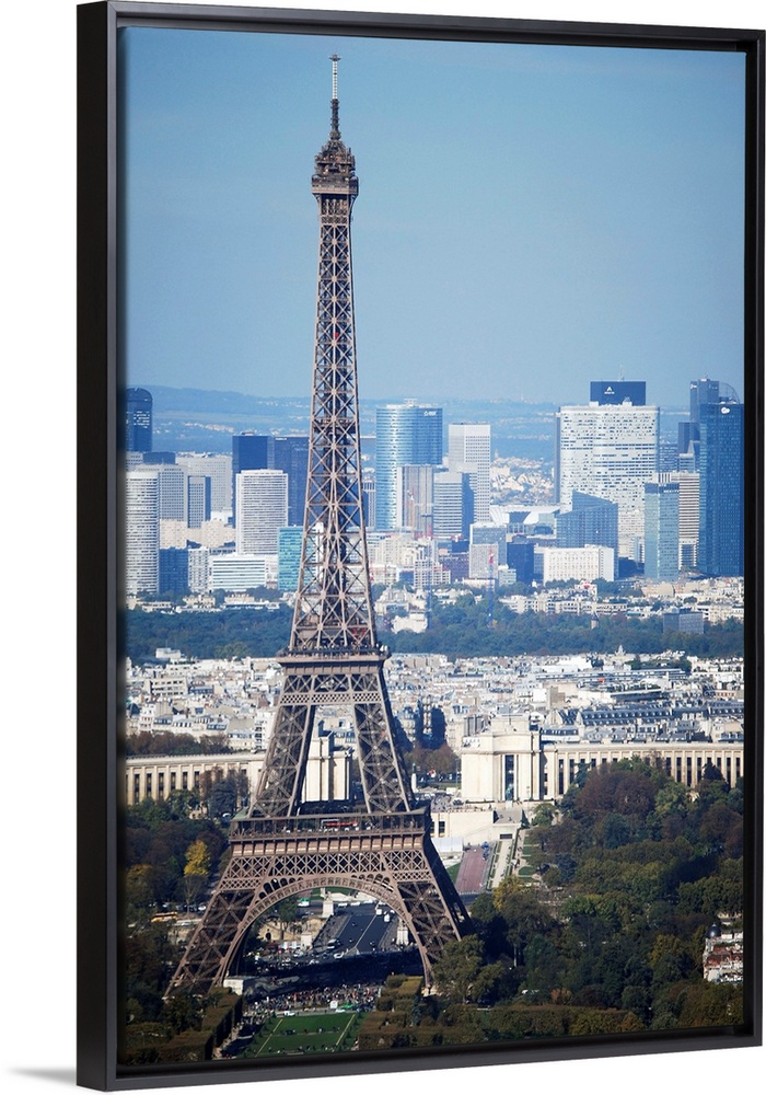 <p>View of Eiffel Tower (La Tour Eiffel) from top of Montparnasse Tour in Paris France. Skyscrapers of La Defense business district are visible behind it.</p>