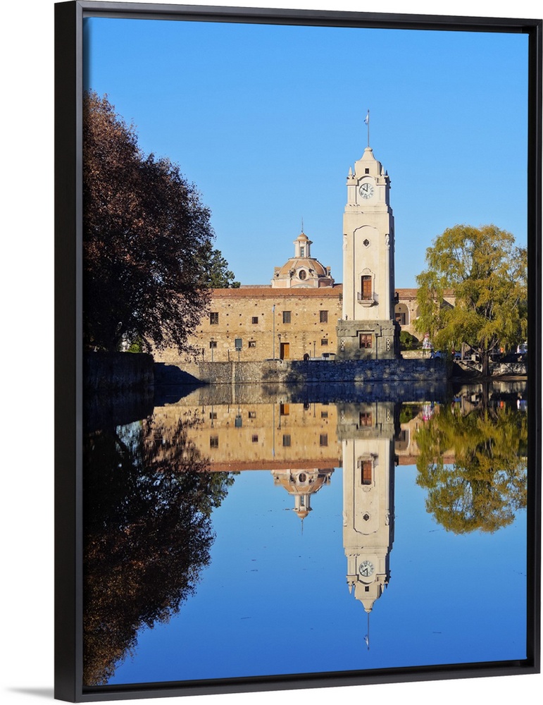 <p>Argentina, Cordoba Province, Alta Gracia, View of El Tajamar Water Reservoir build by Jesuits, the Clock Tower and the Jesuit Estancia.</p>