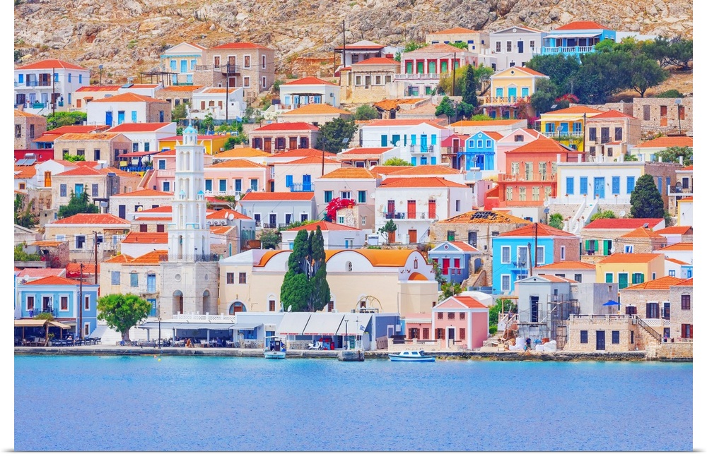 <p>View of Emporio harbour and Saint Nicholas church in the distance, Emporio, Halki Island, Dodecanese Islands, Greek Islands, Greece, Europe</p>