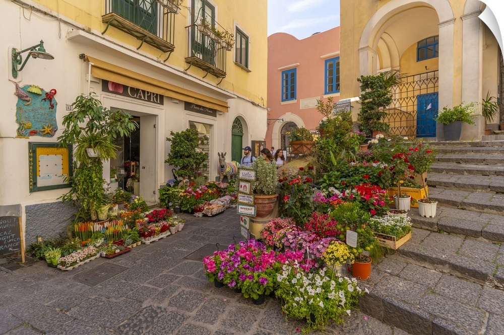 <p>View of flower display outside florists in street, Capri Town, Isle of Capri, Campania, Italy, Mediterranean, Europe</p>