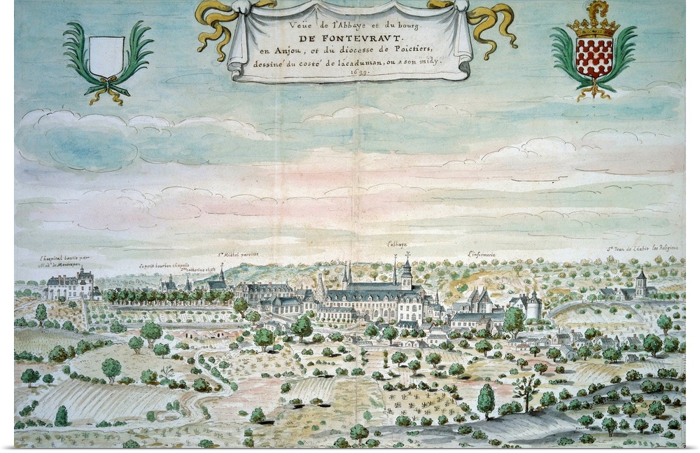 <p>View of Fontevrault (Fontevraud) Abbey, Maine et Loire. Watercolour of the French School. 1699. B.N., Paris, France</p>