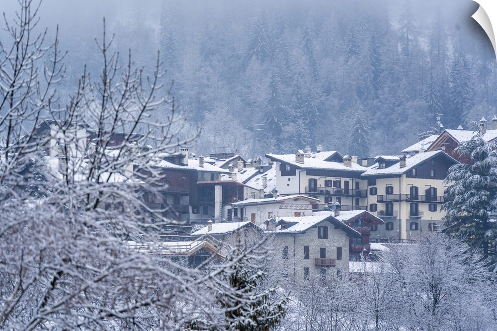 <p>View of frosted trees and chalets in Dolonne during winter, Courmayeur, Aosta Valley, Italy</p>