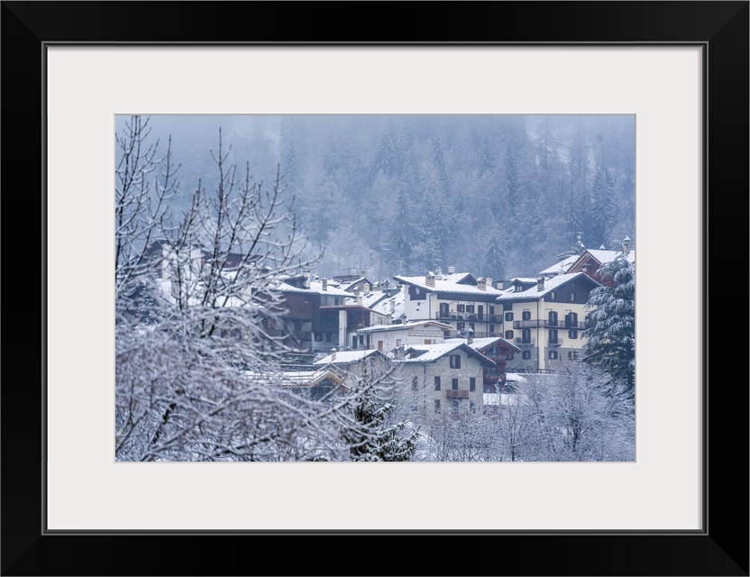<p>View of frosted trees and chalets in Dolonne during winter, Courmayeur, Aosta Valley, Italy</p>