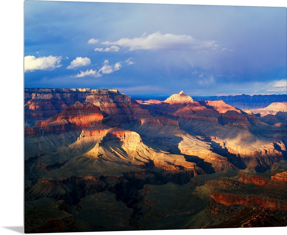 <p>This landscape photograph captures the light passing through the approaching storm and hitting the rock face of several canyon ridges.</p>