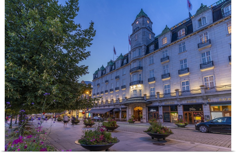 <p>View of Grand Hotel on Karl Johans Gate at dusk, Oslo, Norway, Scandinavia, Europe</p>