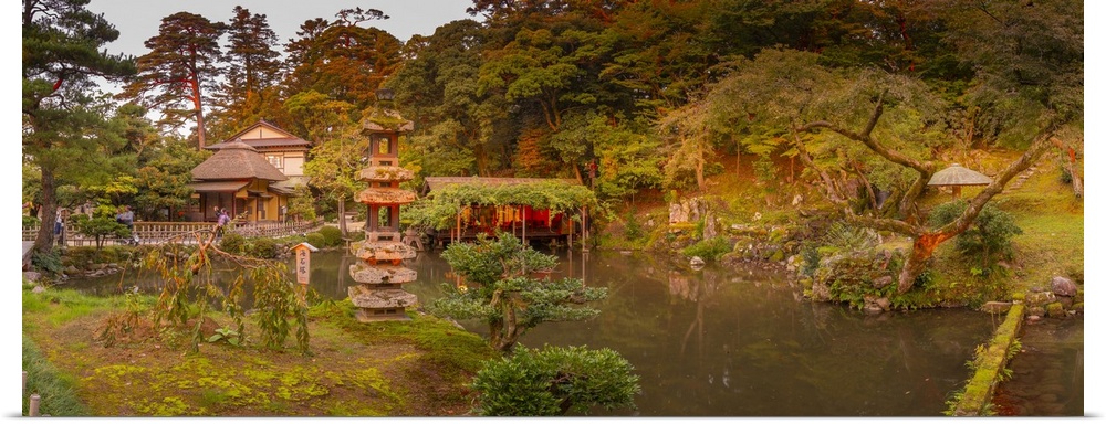 <p>View of Hisago-ike Pond and Kaiseki Pagoda in Kenrokumachi Japanese Garden, Kanazawa City, Ishikawa Prefecture, Honshu, Japan</p>