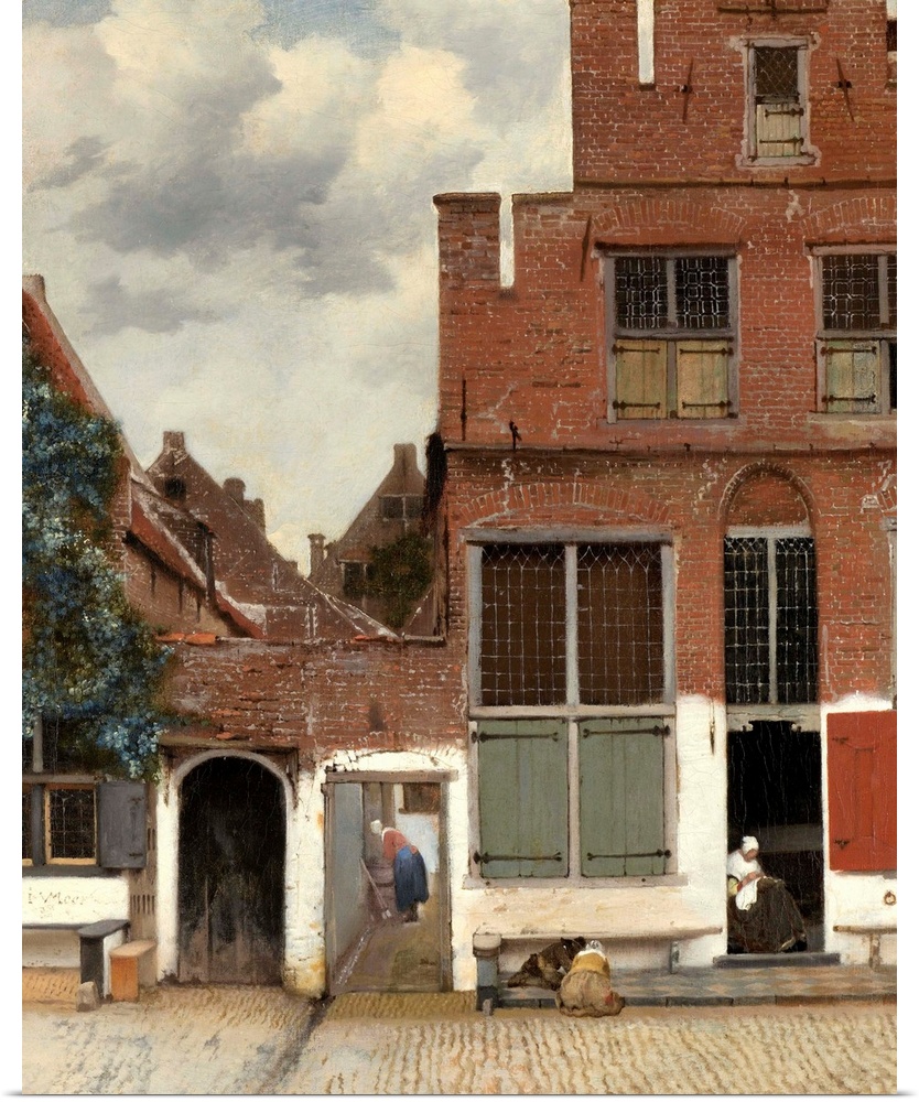 <p>View of Houses in Delft, Johannes Vermeer, 1658, by Dutch painting, oil on canvas. An alternate title is 'The Little Street.' A woman is bent over a washtub in the alley between houses. Another women sits in a doorway to sew in the day light. Two children play on a nearby sidewalk.</p>