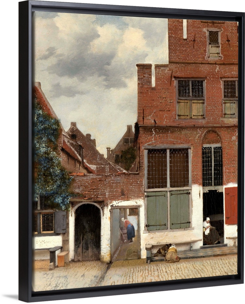 <p>View of Houses in Delft, Johannes Vermeer, 1658, by Dutch painting, oil on canvas. An alternate title is 'The Little Street.' A woman is bent over a washtub in the alley between houses. Another women sits in a doorway to sew in the day light. Two children play on a nearby sidewalk.</p>