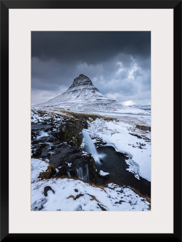 <p>View of Kirkjufell mount at sunset in winter. Grundarfjorour, Snaefellsnes peninsula, Vesturland region, Iceland</p>