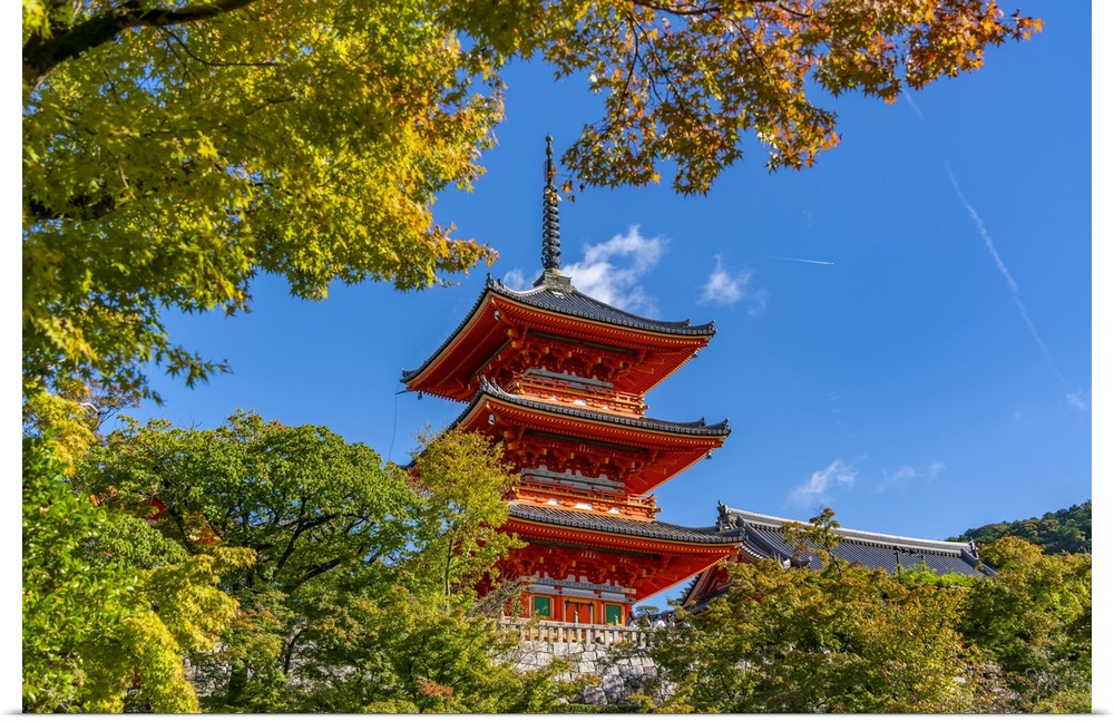 <p>View of Kiyomizu-dera Temple and trees with autumn colours, UNESCO, Kiyomizu, Higashiyama Ward, Kyoto, Honshu, Japan</p>
