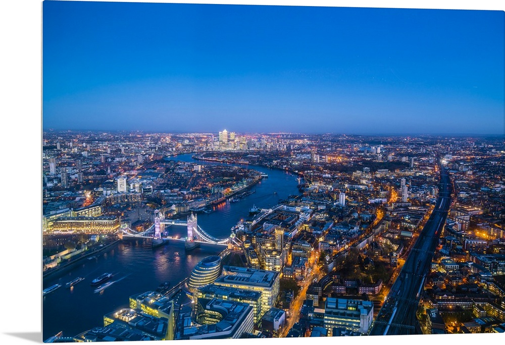 <p>High view of London skyline at dusk along the River Thames from Tower Bridge to Canary Wharf, London, England, United Kingdom, Europe</p>