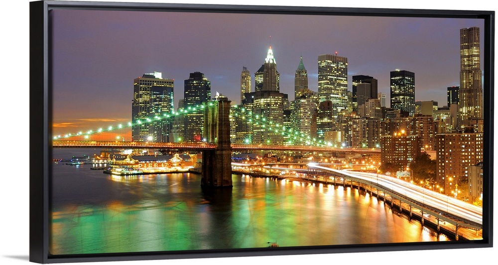 <p>Oversized, horizontal photograph of bright lights of the Brooklyn Bridge and New York City, at night.</p>