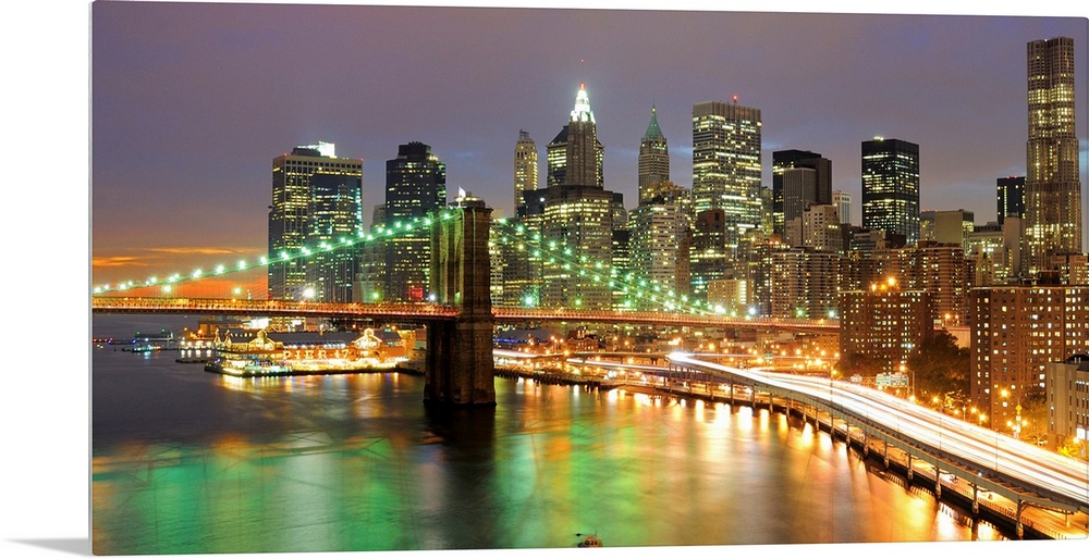 <p>Oversized, horizontal photograph of bright lights of the Brooklyn Bridge and New York City, at night.</p>