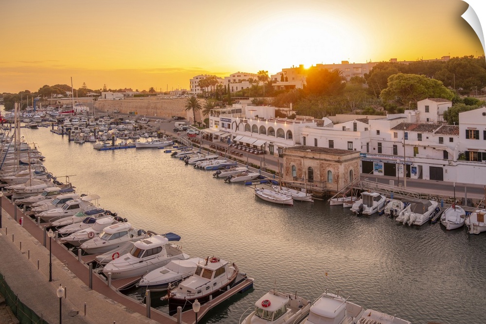 <p>View of marina at sunset from elevated position, Ciutadella, Menorca, Balearic Islands, Spain, Mediterranean, Europe</p>