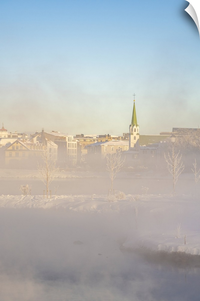 <p>View of morning mist in Tjornin park and Lutheran Free Church on a sunny day in winter, Reykjavik, Iceland</p>
