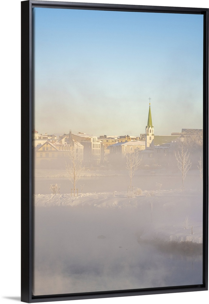 <p>View of morning mist in Tjornin park and Lutheran Free Church on a sunny day in winter, Reykjavik, Iceland</p>