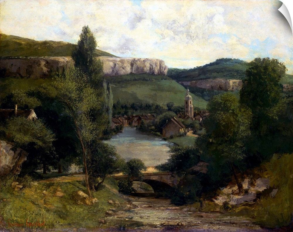 <p>This landscape, probably painted in the mid-1850s, stands at the beginning of a long series of views of the countryside of the artist's native town. It may be identified by the distinctive church steeple that rises above the cluster of houses along the banks of the river Loue. The cliff in the distance is the Roche du Mont. The bridge has traditionally been identified as that of the town of Scey-en-Varais, located a few miles downstream from Ornans.</p>