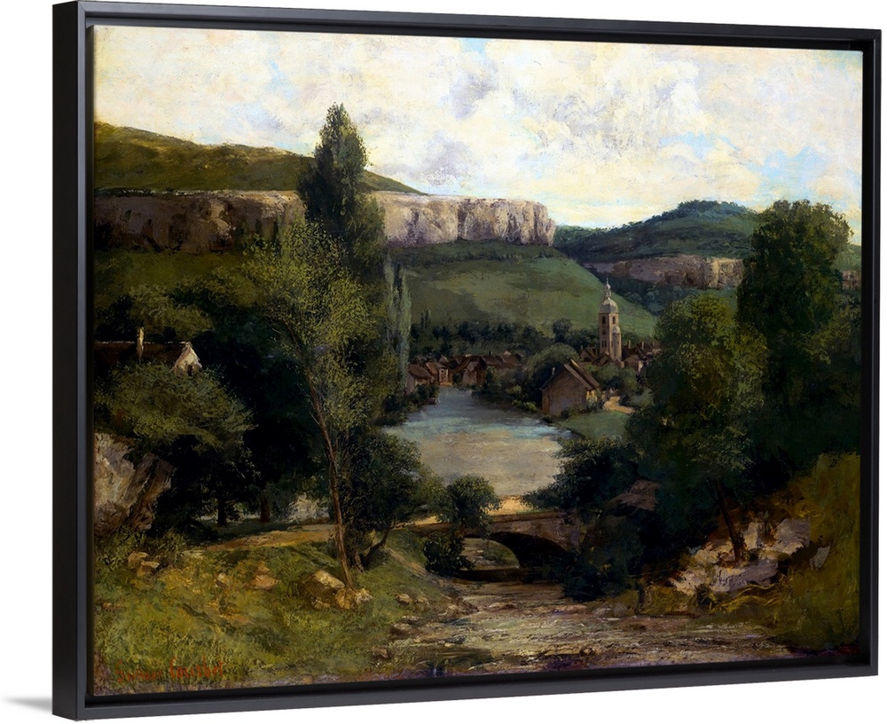 <p>This landscape, probably painted in the mid-1850s, stands at the beginning of a long series of views of the countryside of the artist's native town. It may be identified by the distinctive church steeple that rises above the cluster of houses along the banks of the river Loue. The cliff in the distance is the Roche du Mont. The bridge has traditionally been identified as that of the town of Scey-en-Varais, located a few miles downstream from Ornans.</p>