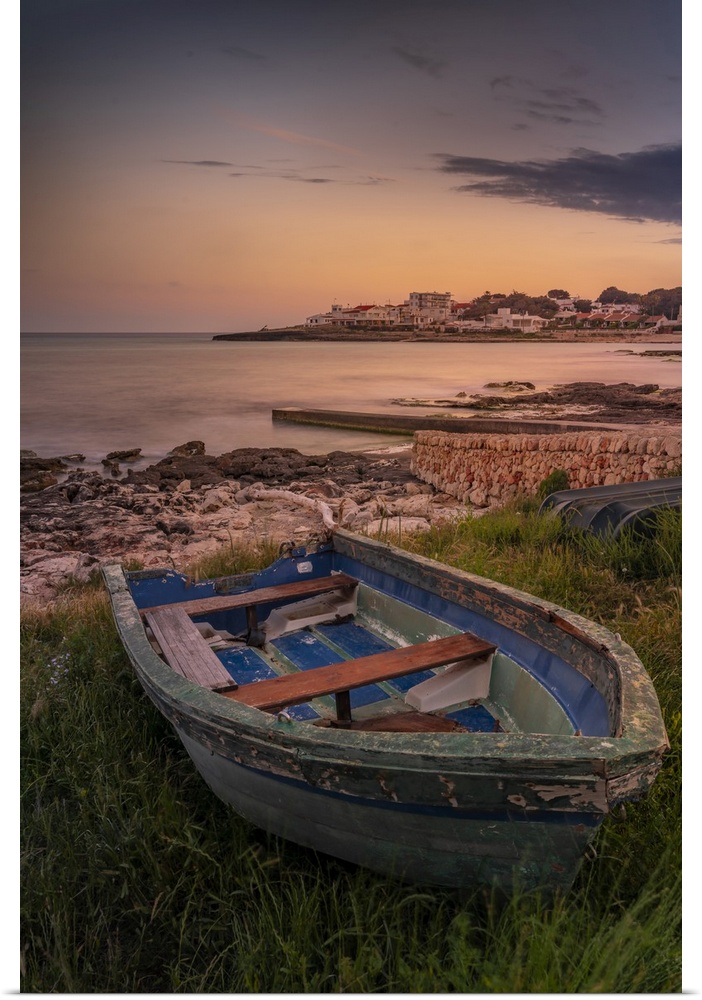 <p>View of Playa Punta Prima and rowing boat at dusk, Punta Prima, Menorca, Balearic Islands, Spain, Mediterranean, Europe</p>