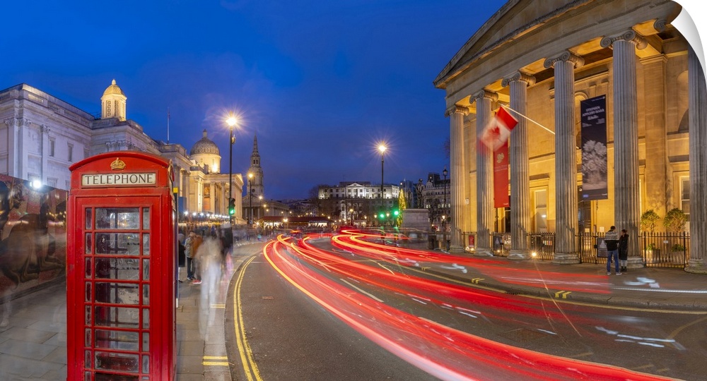 <p>View of red telephone box and Trafalgar Square at dusk, Westminster, London, England, United Kingdom, Europe</p>