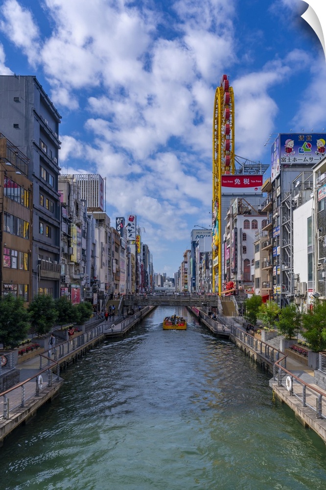 <p>View of restaurants and tour boat in Dotonbori, vibrant entertainment district near the river, Osaka, Honshu, Japan</p>