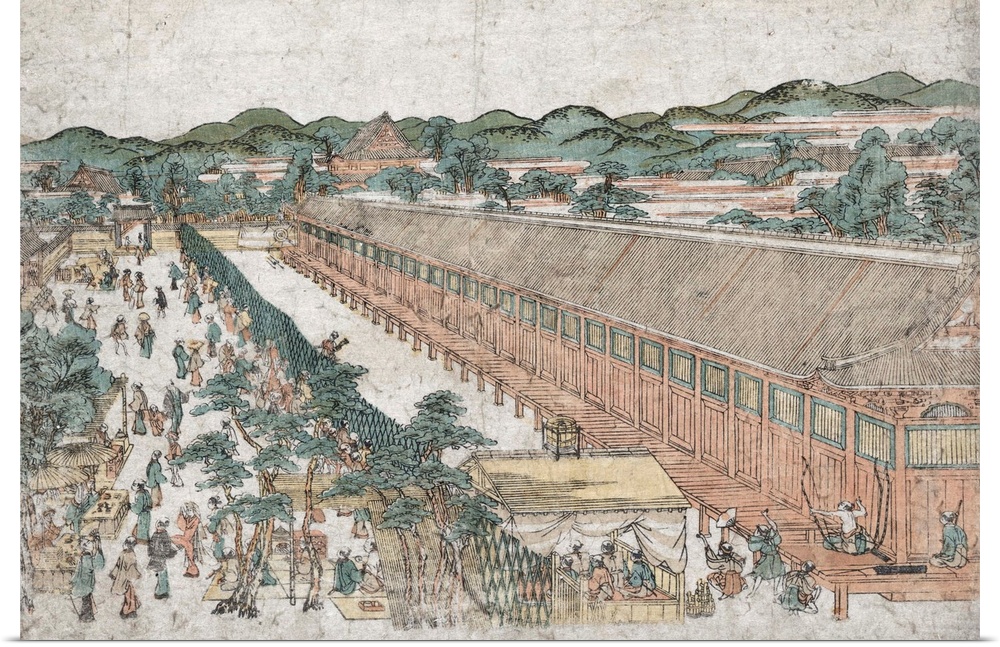 <p>Kyoto sanjusangendo no zu. Woodcut, color ; 24.4 x 36.5 cm. Between 1764 and 1772.</p>