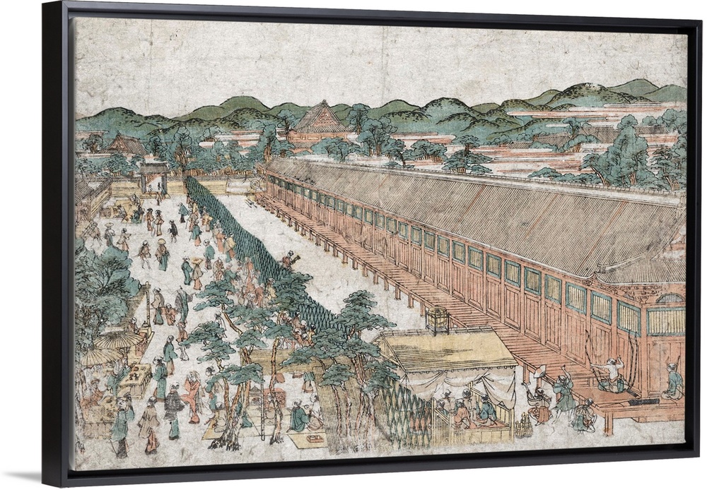 <p>Kyoto sanjusangendo no zu. Woodcut, color ; 24.4 x 36.5 cm. Between 1764 and 1772.</p>