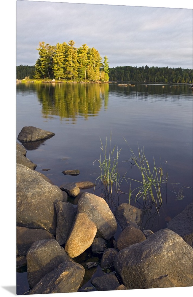 <p>There are rocks in the foreground, an island covered with conifer trees in, and the opposing shore in the background in this vertical nature photograph.</p>