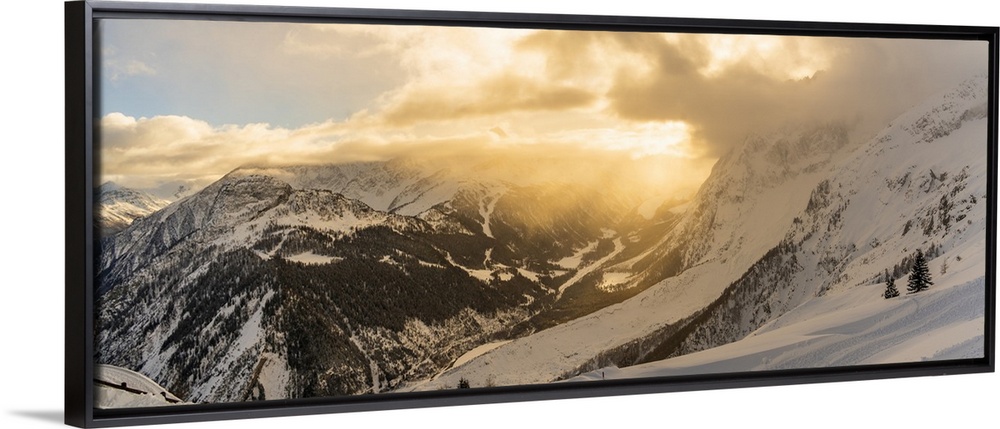 <p>View of snow covered Aosta Valley and mountains from Pavillon du Mont Frety in winter, Courmayeur, Aosta Valley, Italian Alps, Italy</p>