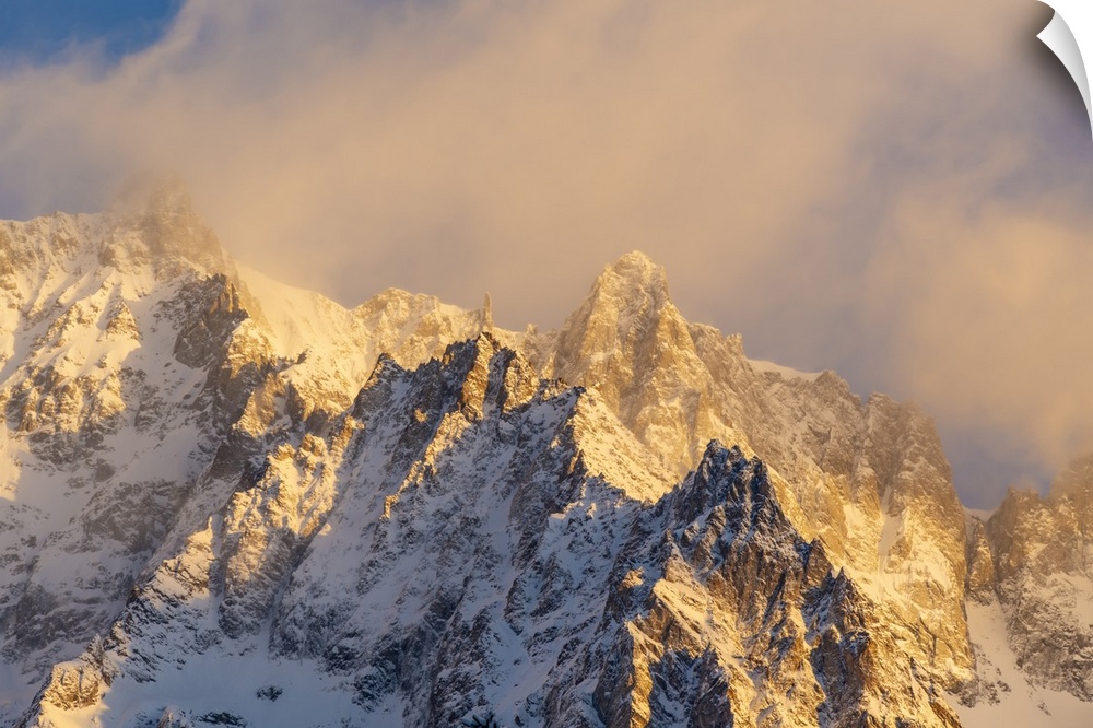 <p>View of snow covered mountains from Courmayeur at sunrise in winter, Courmayeur, Aosta Valley, Italian Alps, Italy</p>