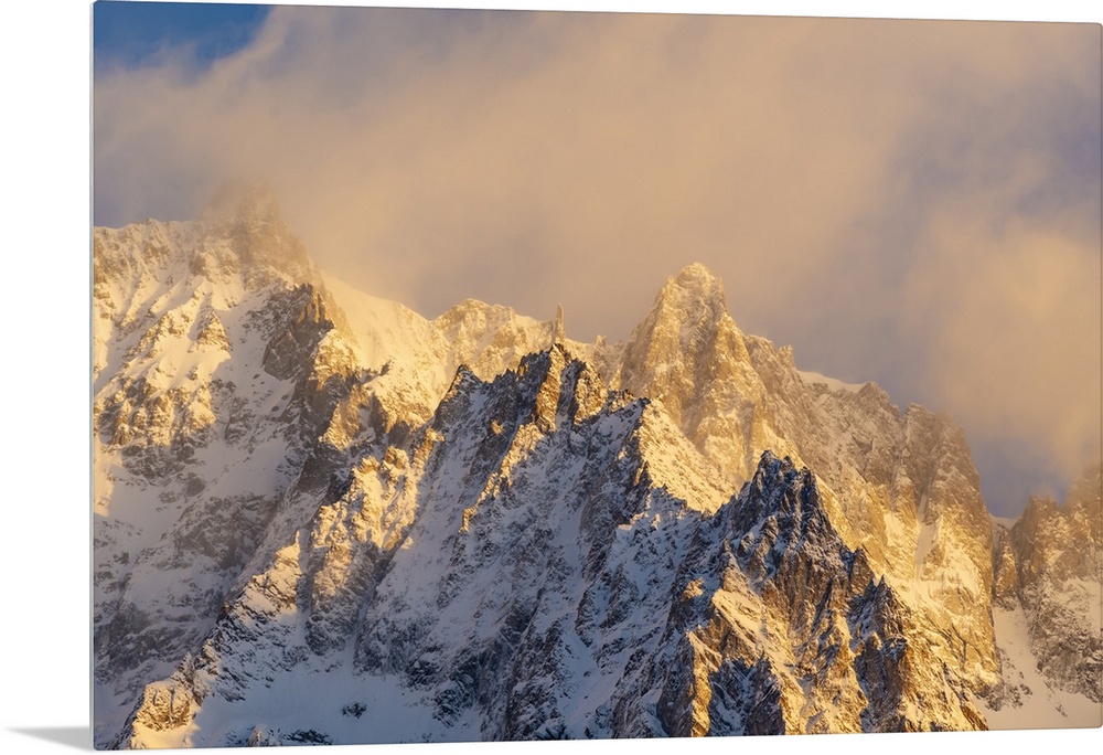 <p>View of snow covered mountains from Courmayeur at sunrise in winter, Courmayeur, Aosta Valley, Italian Alps, Italy</p>