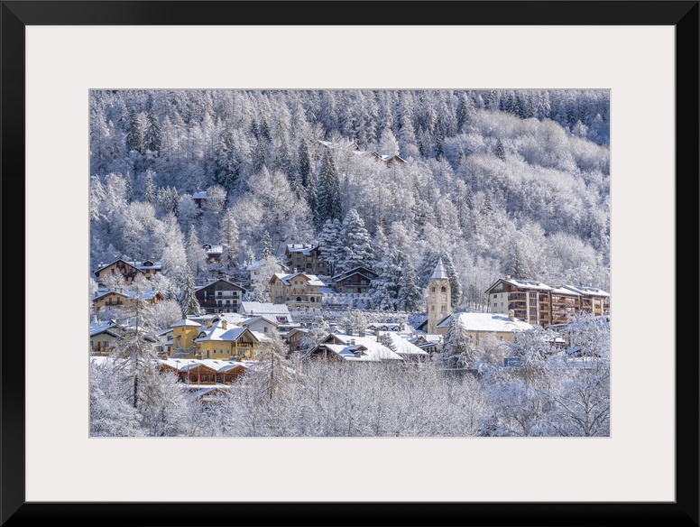 <p>View of snow covered trees and Courmayeur from Dolonne in winter, Courmayeur, Aosta Valley, Italian Alps, Italy</p>