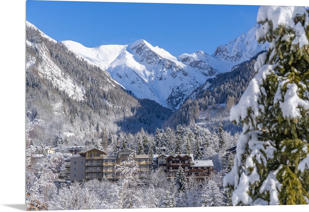 <p>View of snow covered trees, mountains and Courmayeur from Dolonne in winter, Courmayeur, Aosta Valley, Italian Alps, Italy</p>
