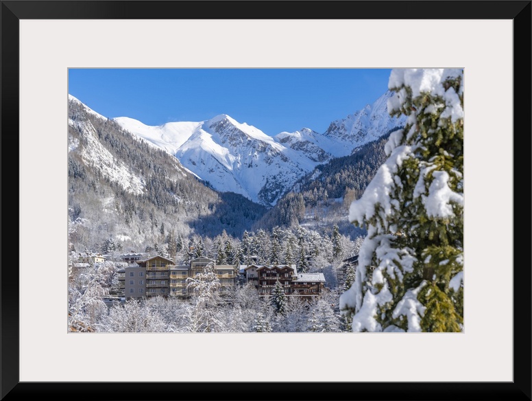 <p>View of snow covered trees, mountains and Courmayeur from Dolonne in winter, Courmayeur, Aosta Valley, Italian Alps, Italy</p>