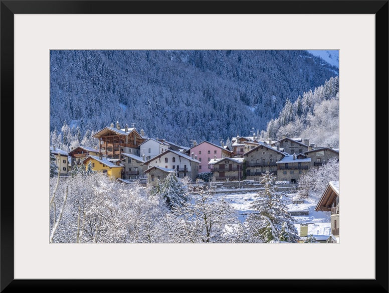 <p>View of snow covered trees, mountains and Dolonne from Courmayeur in winter, Courmayeur, Aosta Valley, Italian Alps, Italy</p>
